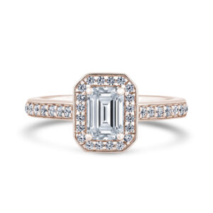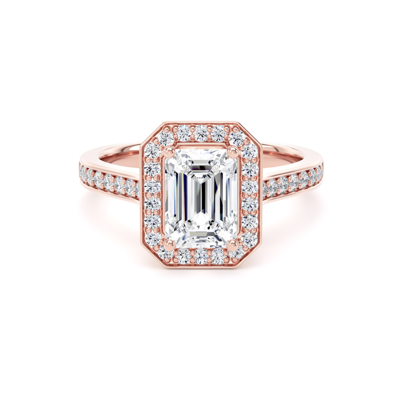 Choose a premium lab-grown or natural diamond for this stunning ring. The elongated emerald centre diamond features exceptional clarity and captivating brilliance. A single halo surrounds the centre stone, enhancing its size, sparkle, and presence.