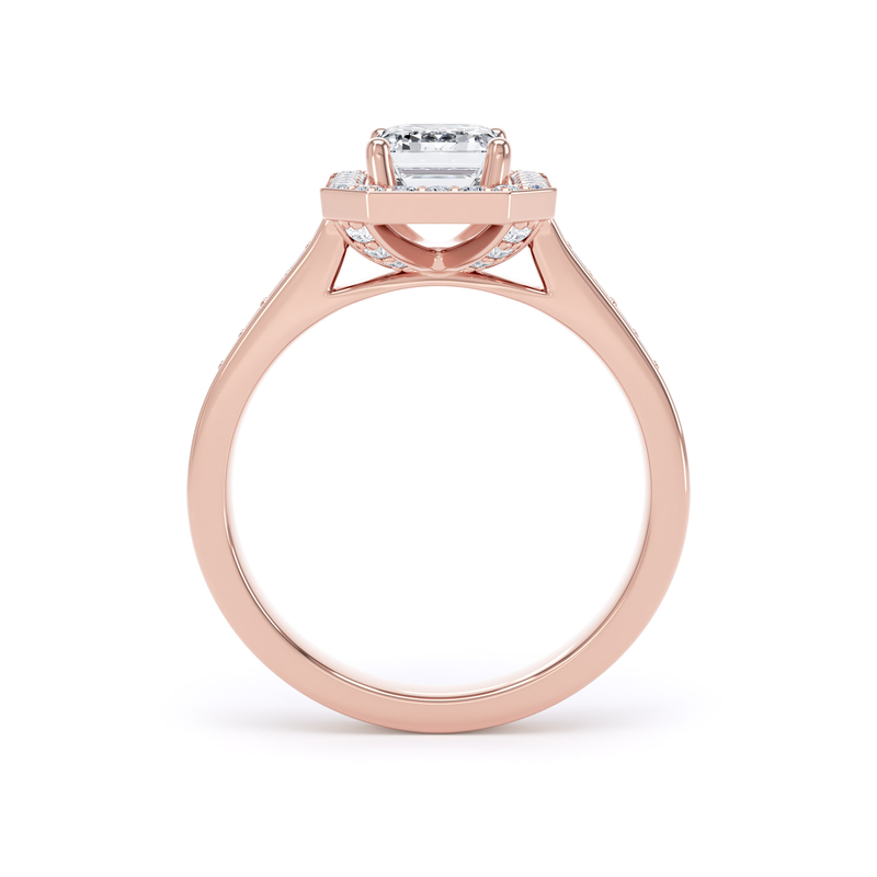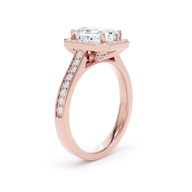 Emerald Diamond Single Halo Ring with Diamond Band & Diamond Basket in 18k Rose Gold.
