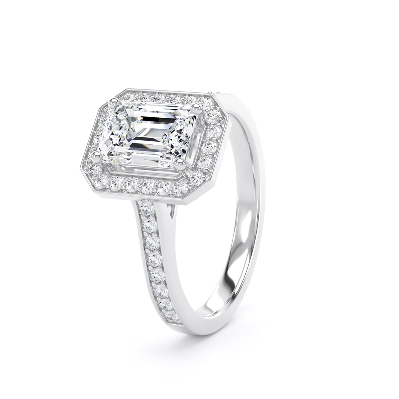 Choose a premium lab-grown or natural diamond for this stunning ring. The elongated emerald centre diamond features exceptional clarity and captivating brilliance. A single halo surrounds the centre stone, enhancing its size, sparkle, and presence.