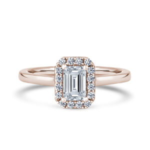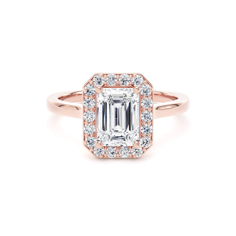 This floating cathedral engagement ring features an emerald diamond secured in a four-prong setting. A single halo of diamonds surrounds the centre stone, enhancing its brilliance while maintaining a refined profile. The cathedral shoulders elevate the setting, creating a clean floating effect.