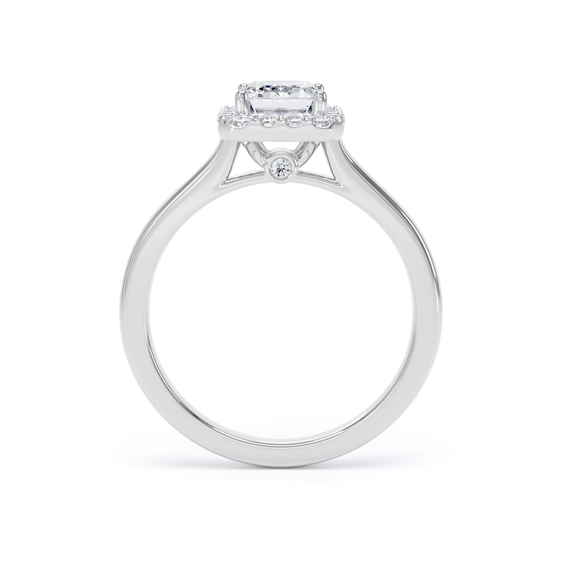 A beautiful halo surrounds the centre diamond, held securely by four prongs in an elegant cathedral setting. Beneath the collet, a hidden diamond adds a private touch of sparkle, an understated detail that brings a sense of quiet luxury and thoughtful craftsmanship.