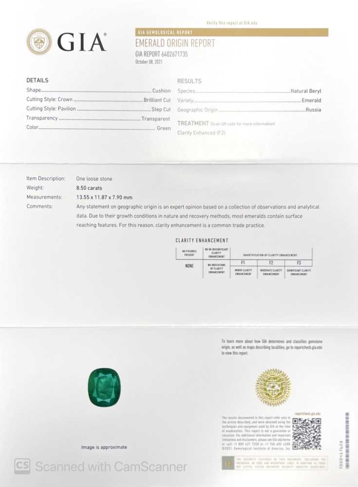 Emerald – Cushion 8.5ct+ 8.5ct/st