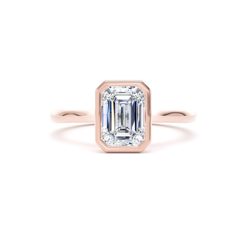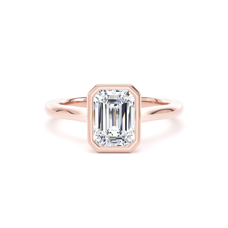 Choose a premium lab-grown or natural diamond for this exceptional ring. The smooth bezel setting securely frames the centre diamond, creating a clean, modern look while enhancing its striking step-cut facets.