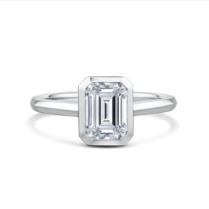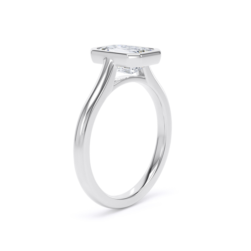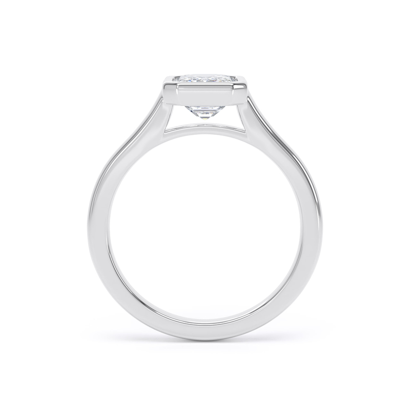 Choose a premium lab-grown or natural diamond for this exceptional ring. The smooth bezel setting securely frames the centre diamond, creating a clean, modern look while enhancing its striking step-cut facets.