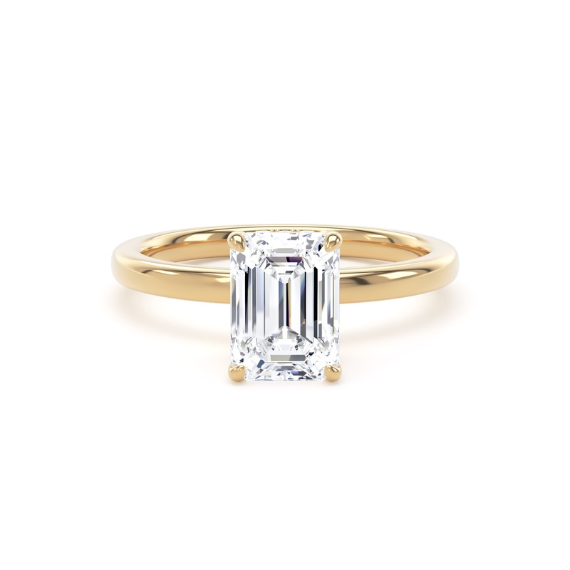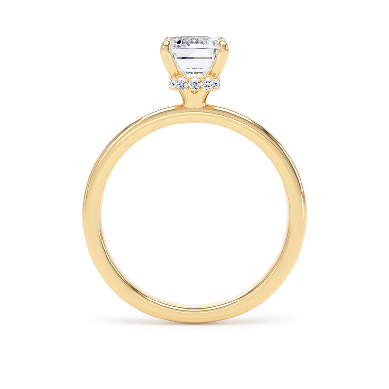 This solitaire engagement ring in 18K yellow gold features a breathtaking emerald-cut diamond, enhanced by a wrap-around hidden halo in a timeless traditional setting with elegant, taller claws.