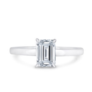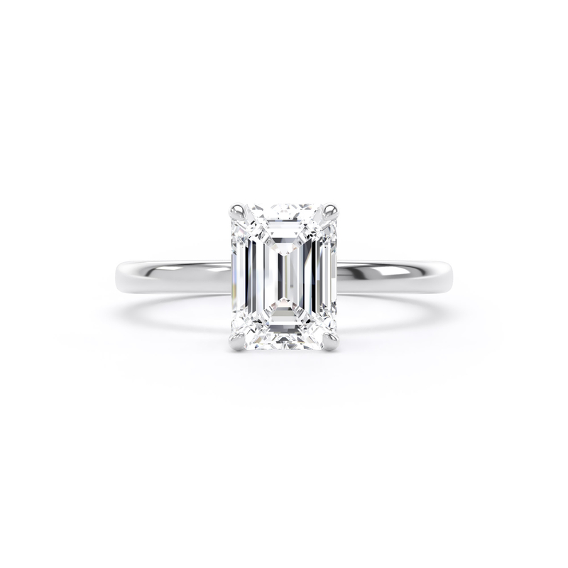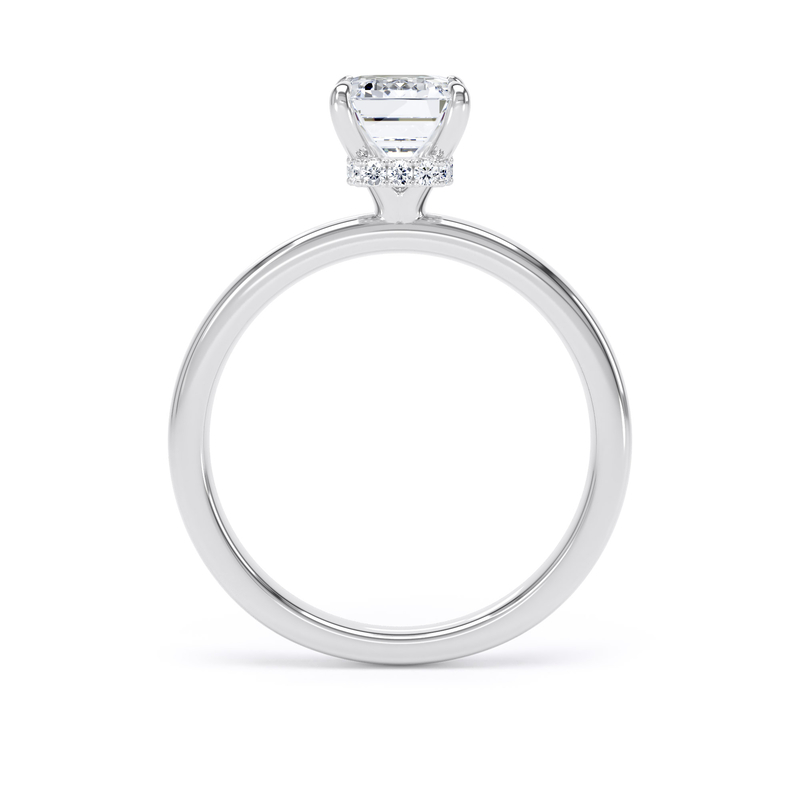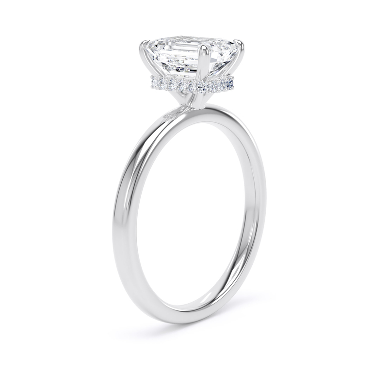 This solitaire engagement ring in platinum features a breathtaking emerald-cut diamond, enhanced by a wrap-around hidden halo in a timeless traditional setting with elegant, taller claws.