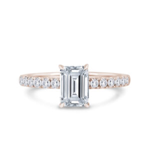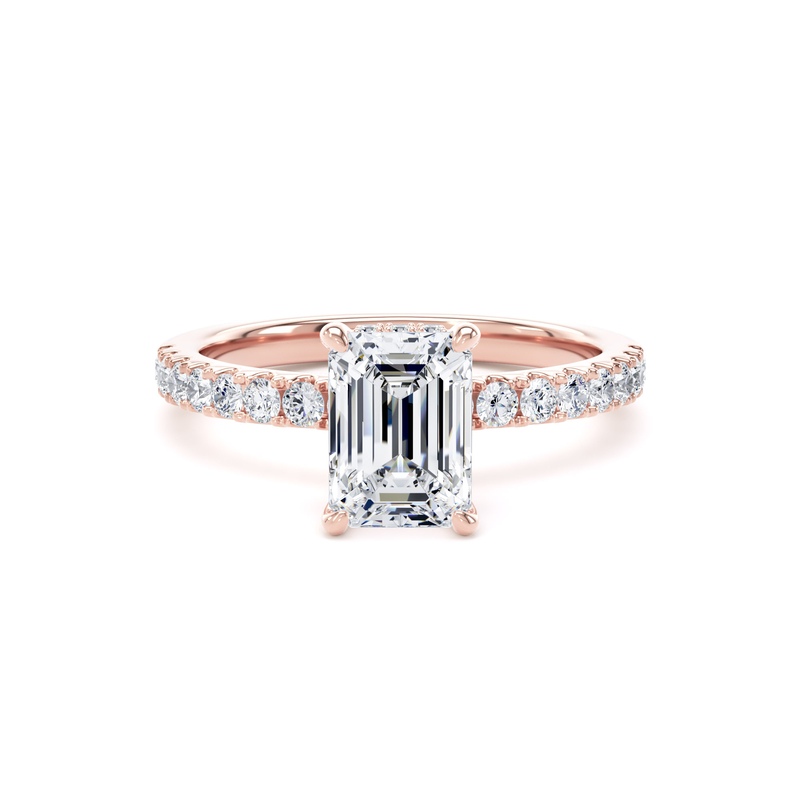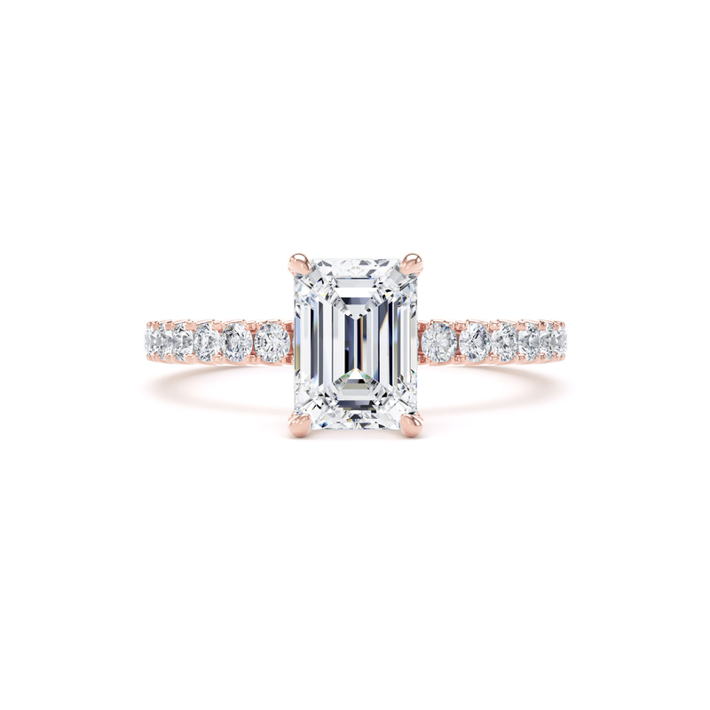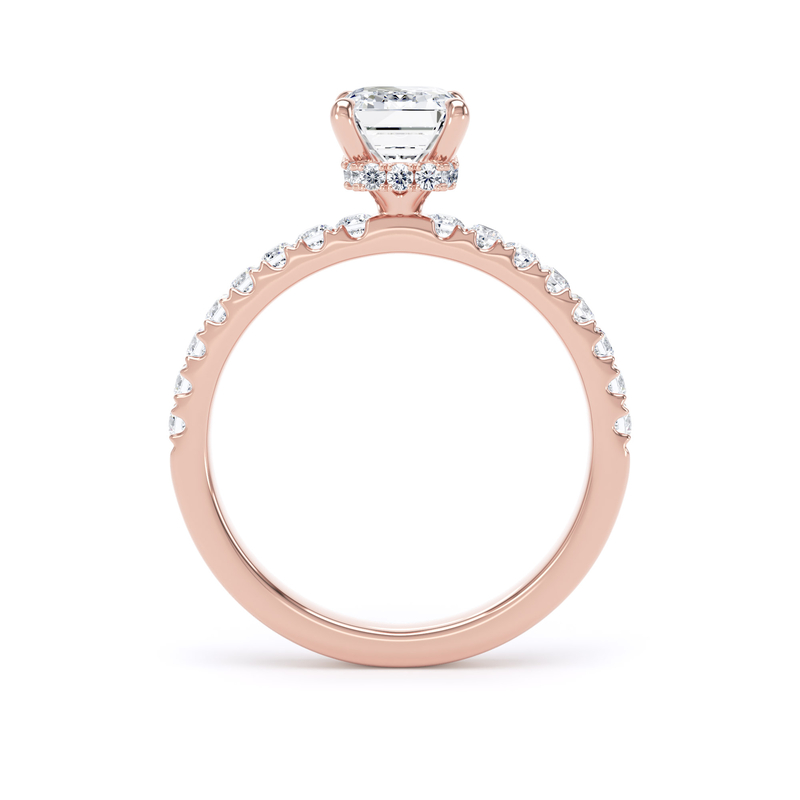 This solitaire engagement ring in 18K rose gold features a breathtaking emerald-cut diamond, complemented by diamond-set shoulders and a wrap-around hidden halo in a timeless traditional setting.