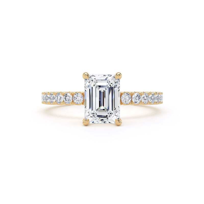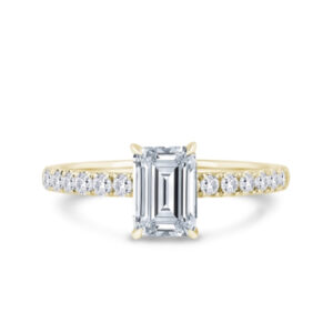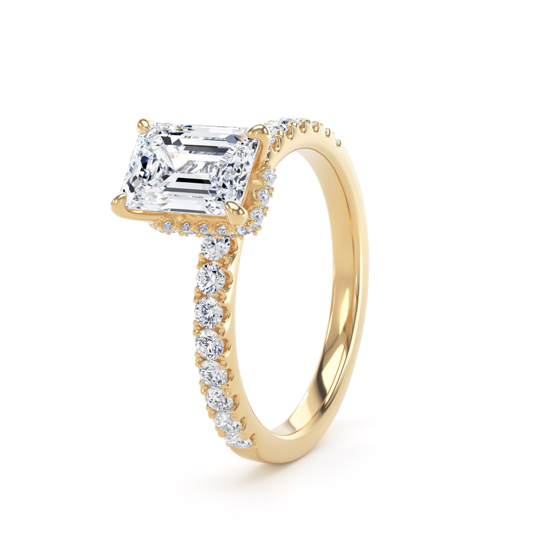 This solitaire engagement ring in 18K yellow gold features a breathtaking emerald-cut diamond, complemented by diamond-set shoulders and a wrap-around hidden halo in a timeless traditional setting.