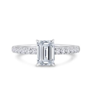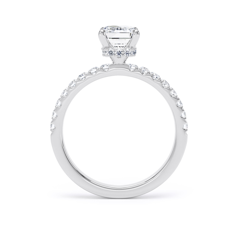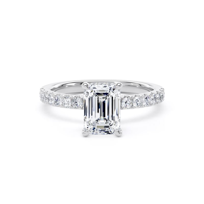 This solitaire engagement ring in platinum features a breathtaking emerald-cut diamond, complemented by diamond-set shoulders and a wrap-around hidden halo in a timeless traditional setting.