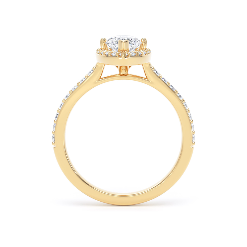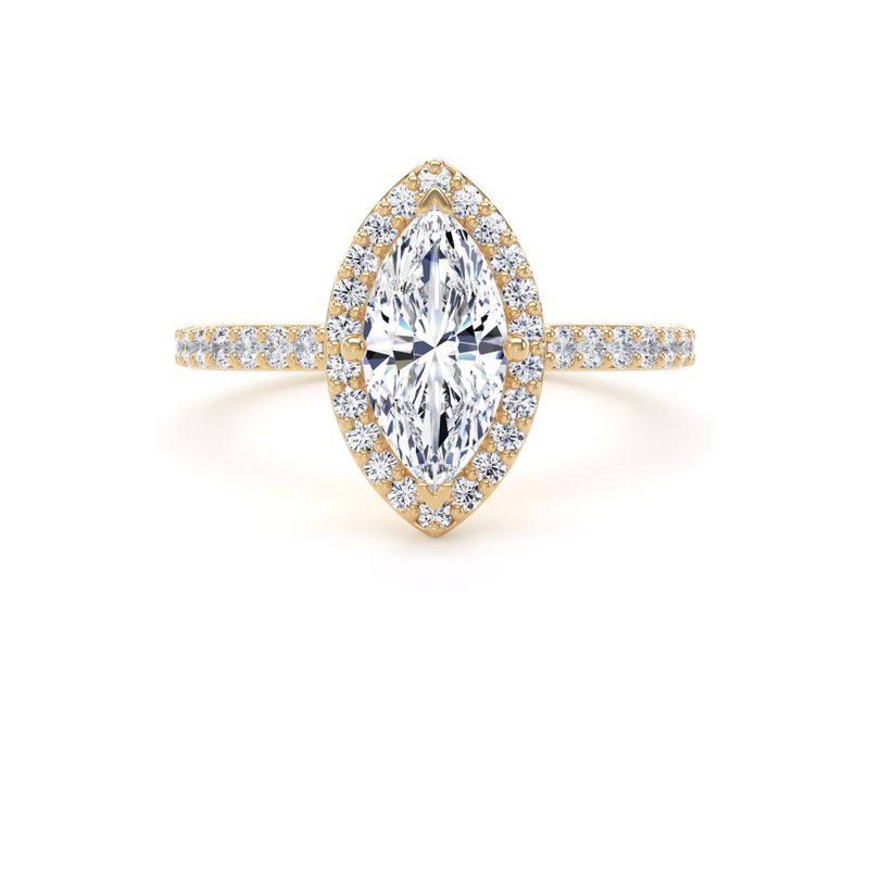 The Marquise Diamond Single Halo Ring with Diamond Band in 18k Yellow Gold.
