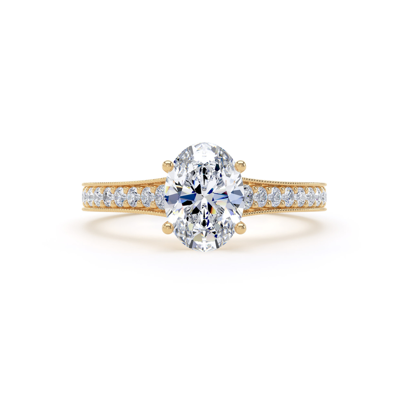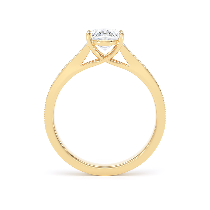 For an added layer of intricate sparkle, a shoulder set ring features a band gracefully adorned with smaller diamonds, leading the eye towards the magnificent centre stone. This elegant design choice enhances the overall brilliance of the ring, creating a continuous and captivating flow of light. Choose a shoulder set design for a timeless look that combines classic sophistication with an extra touch of glamou