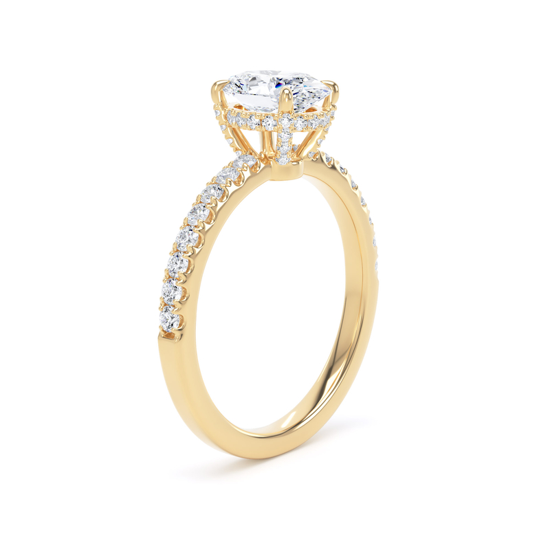 For an added layer of intricate sparkle, a shoulder set ring features a band gracefully adorned with smaller diamonds, leading the eye towards the magnificent centre stone. This elegant design choice enhances the overall brilliance of the ring, creating a continuous and captivating flow of light. Choose a shoulder set design for a timeless look that combines classic sophistication with an extra touch of glamou