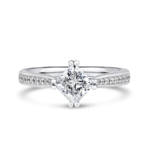 For an added layer of intricate sparkle, a shoulder set ring features a band gracefully adorned with smaller diamonds, leading the eye towards the magnificent centre stone. This elegant design choice enhances the overall brilliance of the ring, creating a continuous and captivating flow of light. Choose a shoulder set design for a timeless look that combines classic sophistication with an extra touch of glamou